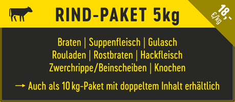 Selbstabholerpreis Rindpaket € 21/kg - Versandpreis Rindpaket € 21/kg.